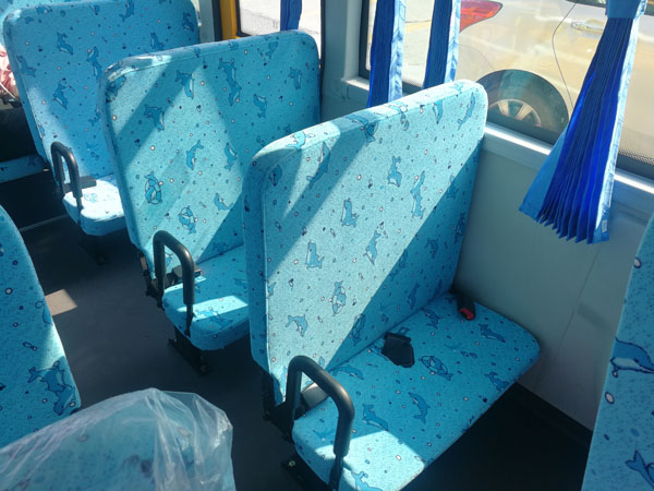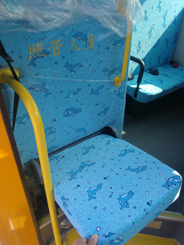 温馨的内饰设计,敞亮的乘坐空间。整车平地板设计,司机采用高靠背座椅,座椅采用低靠背、软包裹的形式,软化护栏。车内配有大型全景后视镜,车内情况一目了然。配有停车指示牌和限速装置,前后路牌、前后停车灯、补盲镜、侧围安全逃生门、灭火器、发动机仓自动灭火装置等进一步保障学生安全。